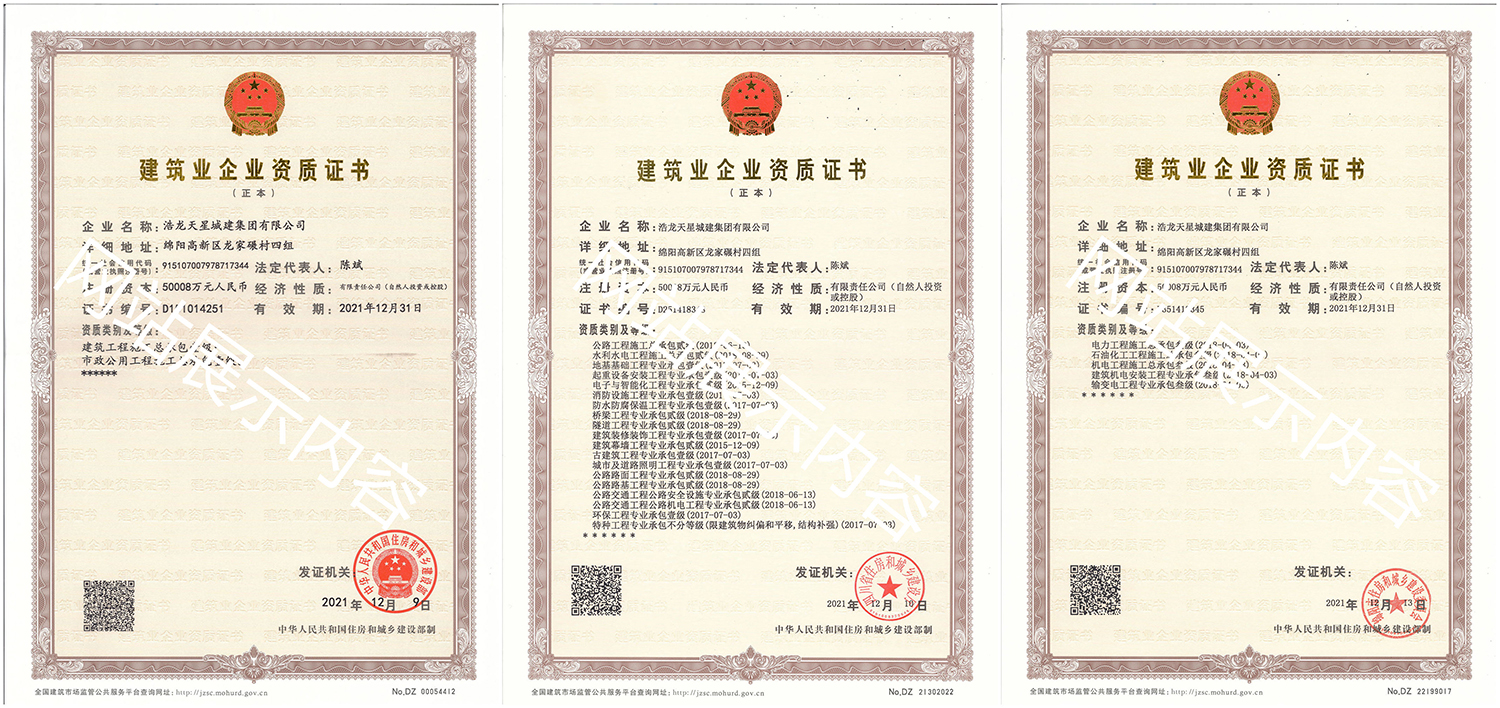 浩龍?zhí)煨浅墙瘓F有限公司,2007年成立于“李白故鄉(xiāng)、中國科技城”—四川省綿陽市,企業(yè)注冊資本金5.0008億元。公司共有27項建筑業(yè)企業(yè)資質,其中國家一級資質11項,二級資質10項,三級資質5項,特種資質不分等級1項,類別涵蓋建筑、市政、水利、機電、隧道、起重設備安裝等基礎及未來發(fā)展重點專業(yè)。公司下設三個辦事處,業(yè)務范圍輻射全國,在建項目三十余個,累計完成產值超11億元。公司是綿陽市建筑施工企業(yè)協(xié)會副會長單位、綿陽遂寧商會會長級單位、綿陽首批建筑業(yè)綠卡企業(yè),在綿陽本地企業(yè)中綜合實力名列前茅。